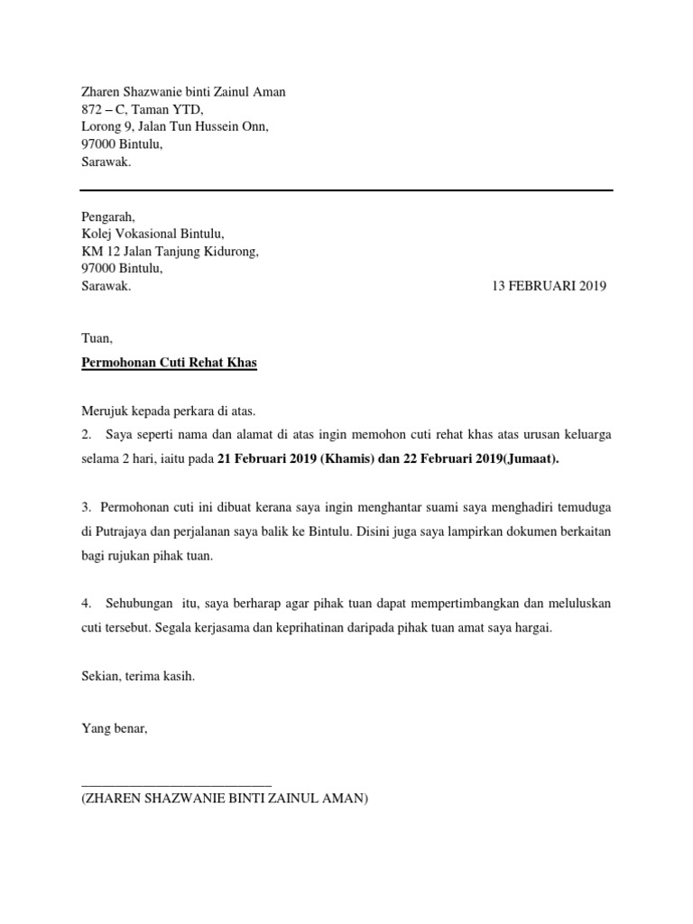 Surat Rasmi Memohon Cuti Rehat Surat Rasmi C